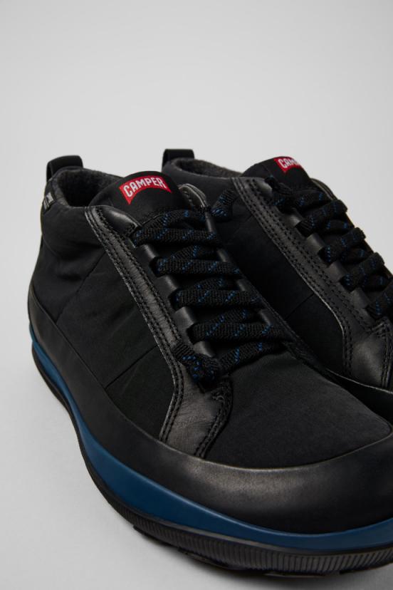 Black recycled nylon and leather men’s ankle boots with a water repellent treatment, PrimaLoft technology, and 27% natural rubber Michelin outsoles. Meet Peu Pista, the most advanced performance style in our iconic Peu family, an all-weather design with Michelin outsoles and cushioned footbeds. Your winter solution.