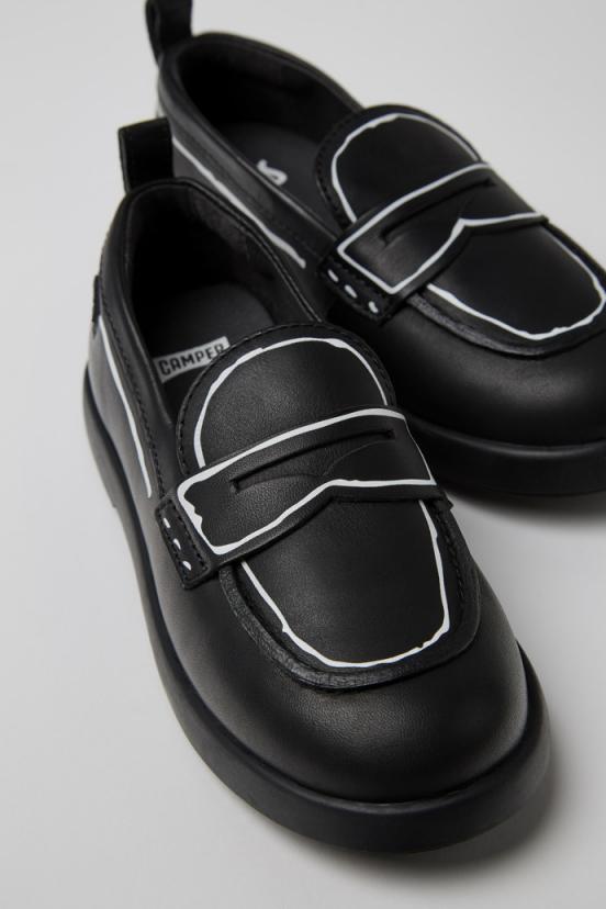 Black leather shoes for kids, with OrthoLite removable footbed and 100% rubber outsoles. In 1988, we challenged the idea that shoes should be identical, designing a mismatched pair with asymmetric details — and our iconic TWINS was born.
