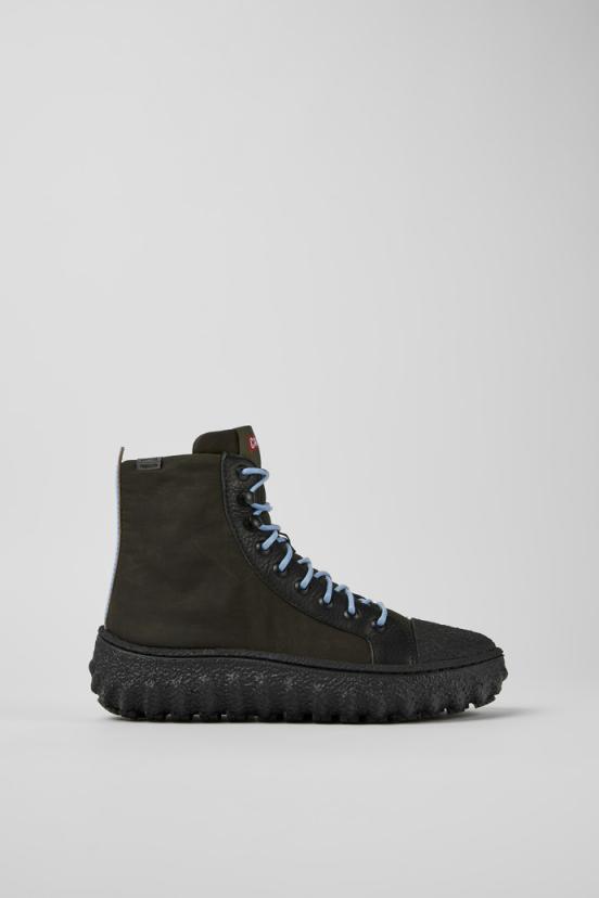 Dark green textile and leather women’s ankle boots with recycled PrimaLoft membranes, OrthoLite Recycled footbeds, and Michelin rubber outsoles (27% natural). Ground reimagines urban street style by adding a contemporary twist on the industrial Camper aesthetic.