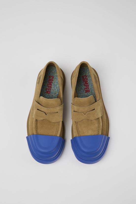 Brown nubuck women’s customizable loafers with recycled OrthoLite footbeds and rubber outsoles. Made with minimal components and glue, Junction is easy to disassemble promoting a more circular approach to shoe-making.
