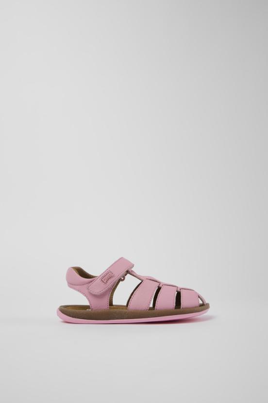 Pink leather kids’ sandals with hook-and-loop closures and rubber outsoles. Our Bicho sandals offer an adjustable design and an ergonomic footbed made of rubber and recycled rice husks for natural movement.