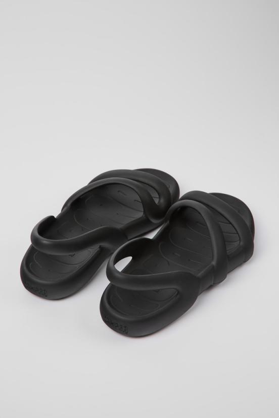 Black XL EXTRALIGHT OrganixTM 3.0 biocircular components men’s sandals. The flat version of the Kobarah heel is also made with fully recyclable materials and retains the voluptuousness, sinuosity and endless flux.
