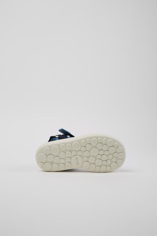Multicolor recycled PET kids’ sandal with hook & loop system, EVA footbed, and EVA outsoles. The kids’ version of Pelotas Flota retains the same simple, minimalist design and bold, rounded volume inspired by inflatable objects.