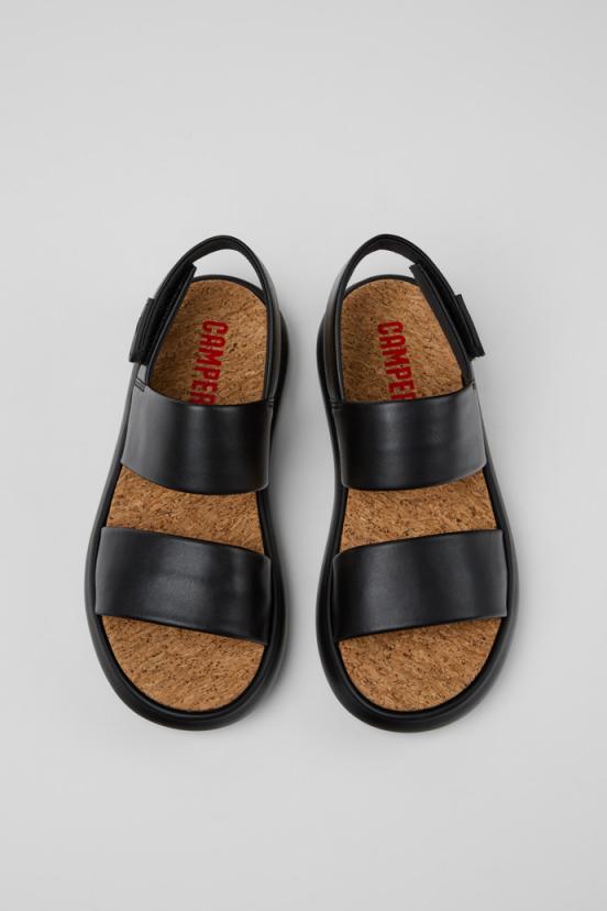 Black leather women’s sandals with an EVA footbed, hook & loop system, and XL EXTRALIGHT OrganixTM 3.0 outsoles (30% biocircular components). Linked to the vintage 1998 Pelotas Norit line from the Camper Archive, Pelotas Flota features a bold volume inspired by inflatable objects.