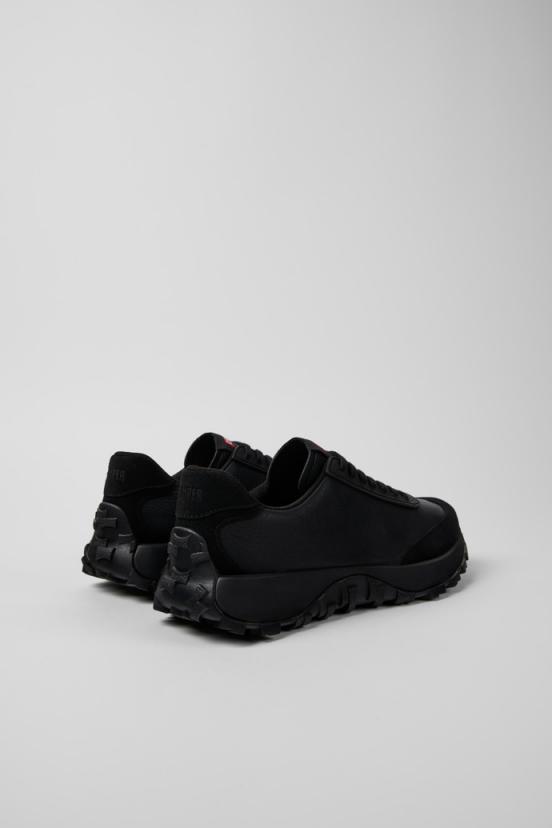 Black leather and nubuck men’s sneakers with OrthoLite Recycled removable footbeds and Vibram outsoles (30% rubber, 70% EVA). Our Drift Trail fuses high-performance innovation with a vintage aesthetic.